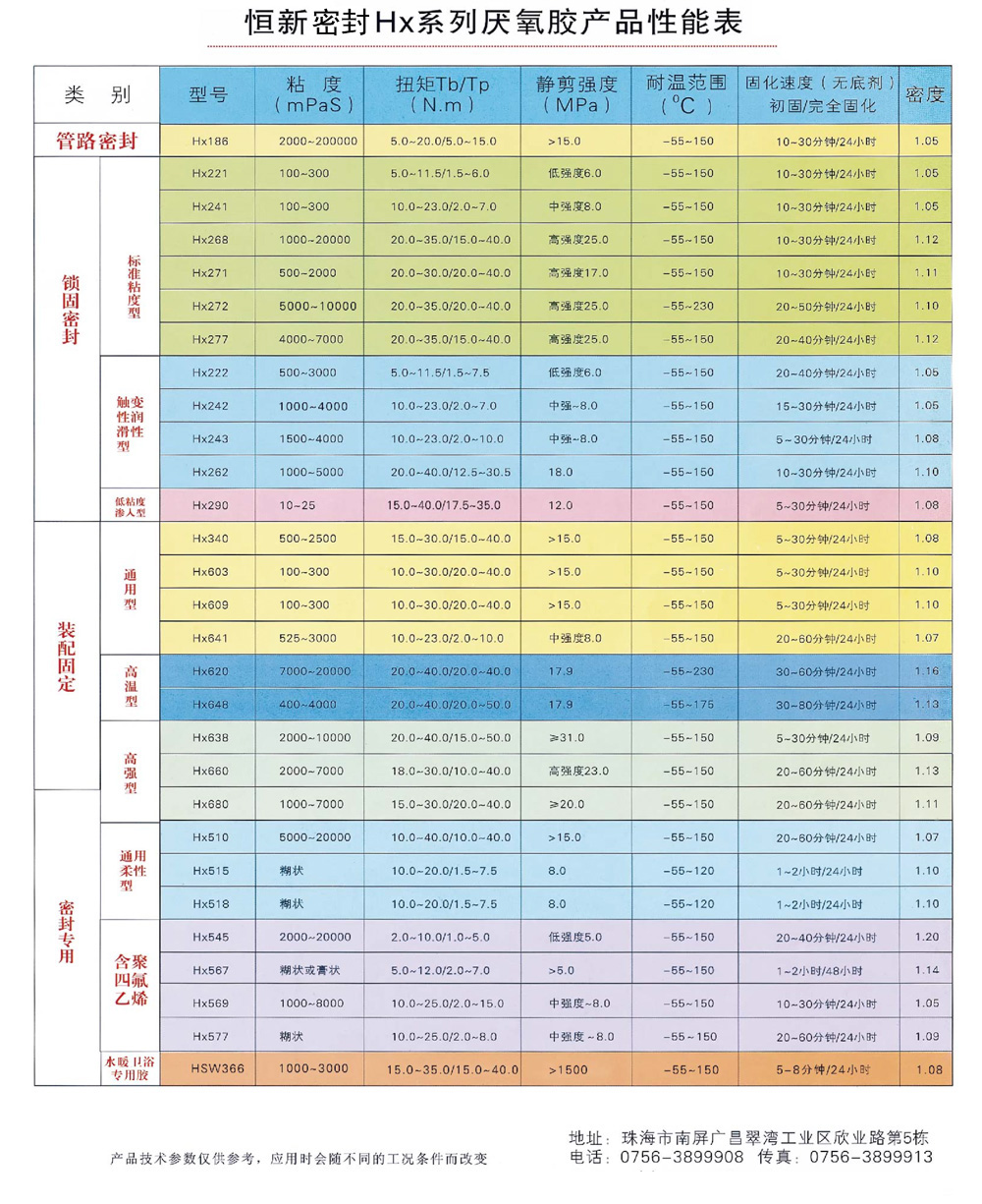 珠海市恒新密封材料有限公司研制生产的HX厌氧胶系列产品,经权威检测部门检测,完全达到国家机械工业部JB/T73U—2001《工程机械厌氧胶应用技术规范》行业标准的技术要求,同时通过了欧盟SGS环保资格认证、美国MSDS安全检测报告、并获得广州市化学工业研究所分析测试中心的安全检测报告、广东省疾病预防控制中心水质安全检测报告。